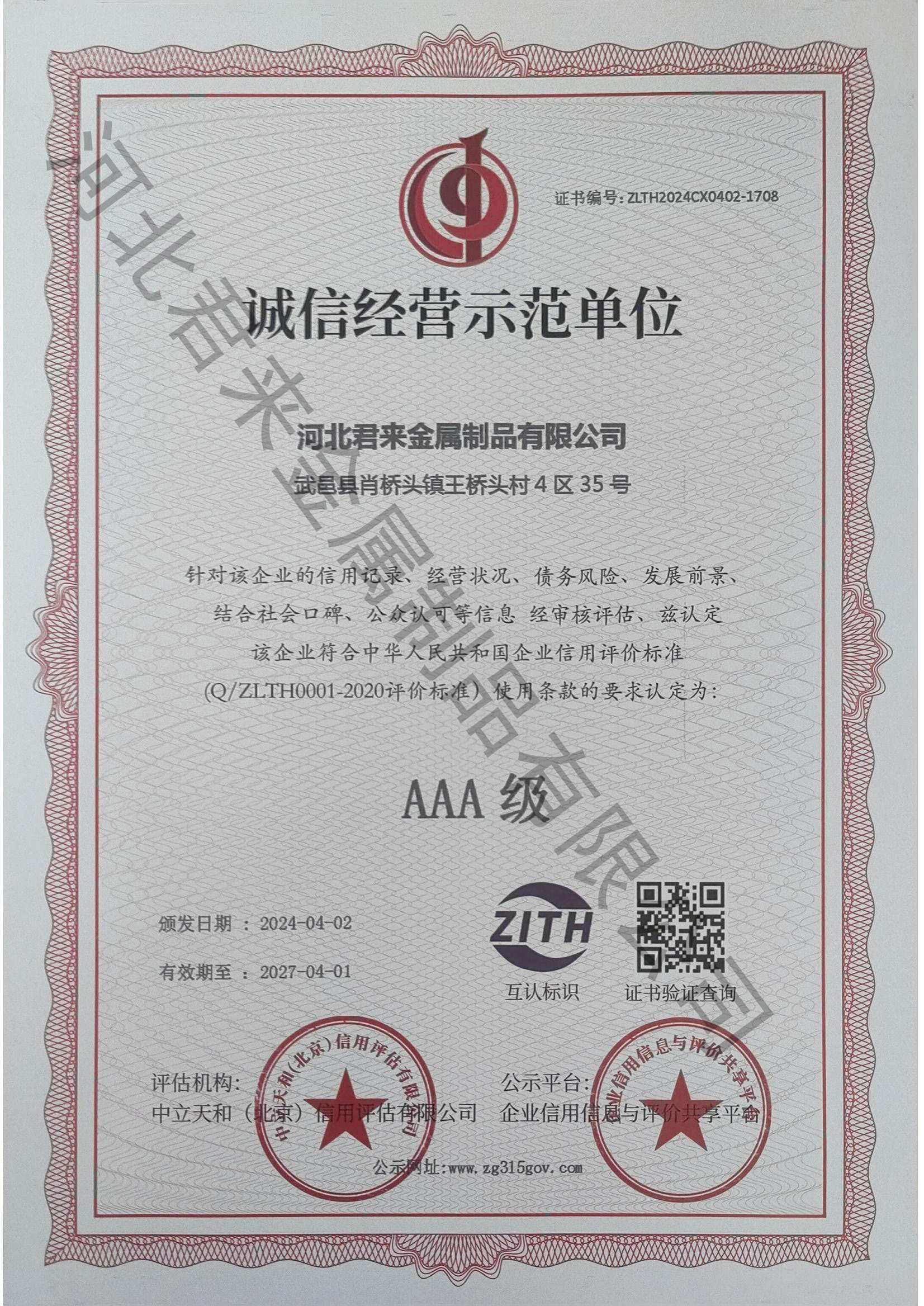 誠信經營示范等級證書