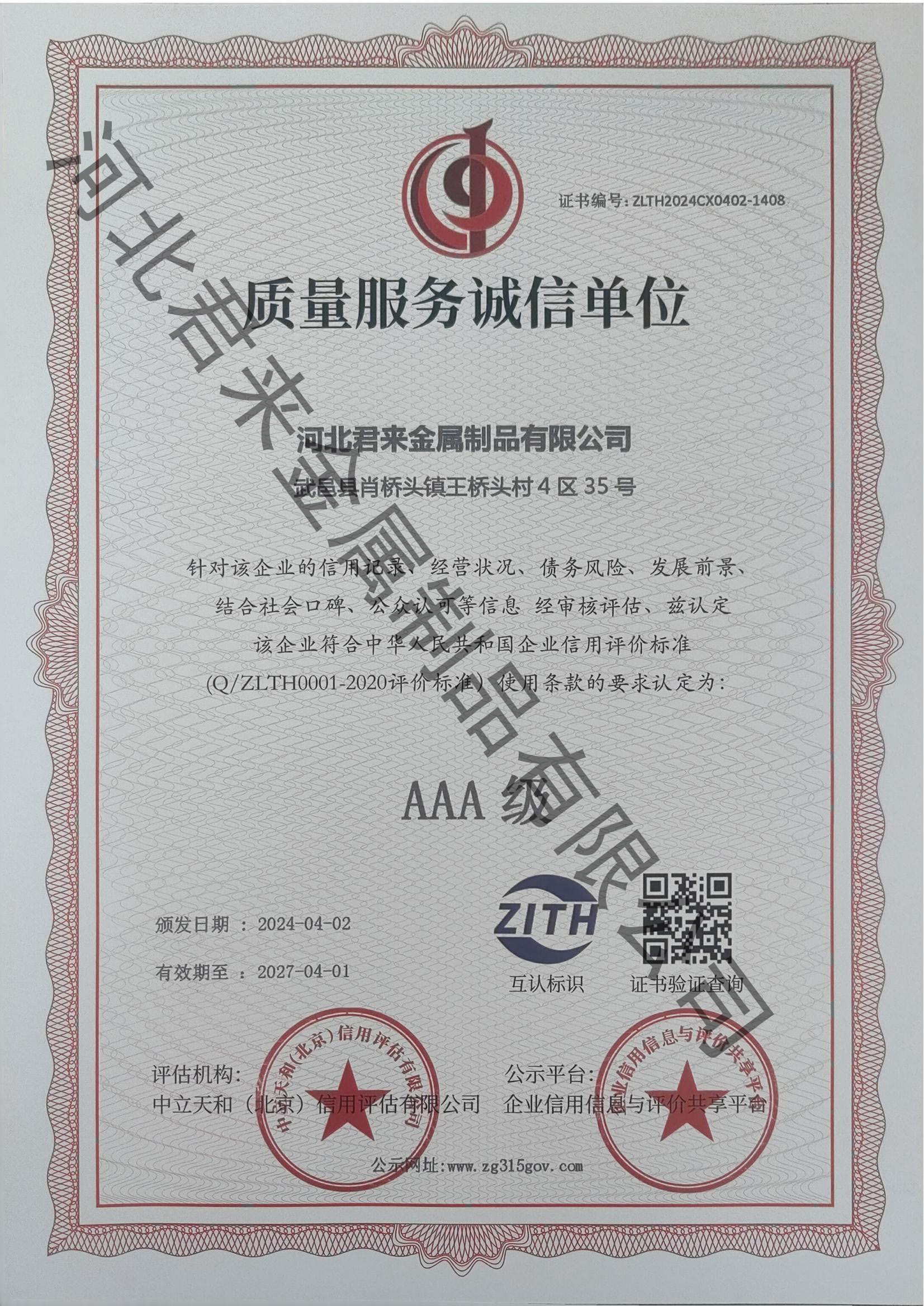 質量服務誠信等級證書